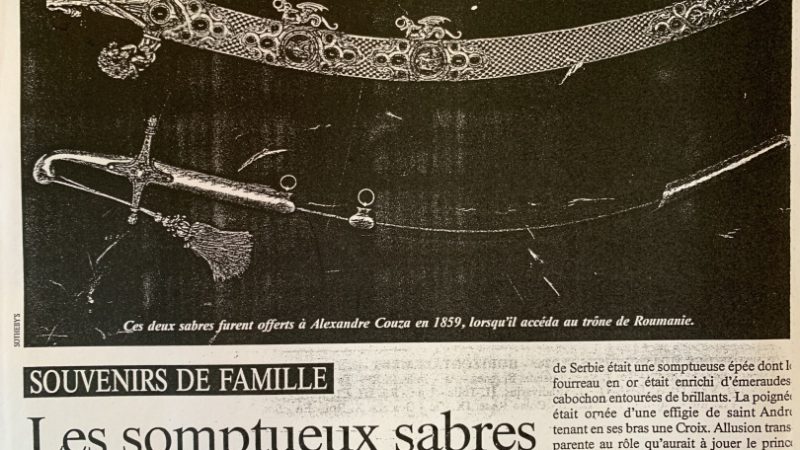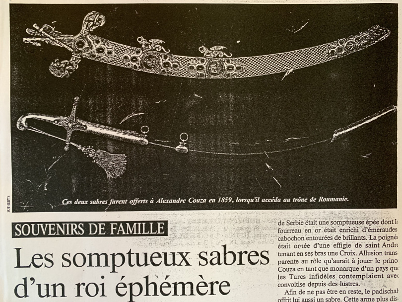 “În 1992, eram ministru al afacerilor externe. La un anumit moment, ambasada de la Paris m-a alertat asupra faptului că într-o revistă din Franţa („Point de vue”, din 2 ianuarie 1992) apăruse un articol in care se vorbea despre vânzarea la licitaţie, la Londra, a două săbii ale domnitorului Alexandru Ioan Cuza. Vânzarea era realizată de rudele îndepărtate ale domnitorului, aflate în Franţa. Am considerat că este de datoria noastră să încercăm să le recuperăm. Am contactat un avocat britanic, pe care l-am instruit în legătură cu licitaţia şi cu limitele în care putea acţiona. Era vorba de DOUĂ săbii, care se vindeau, cred, ca un singur lot. În final, am reuşit să le achiziţionăm. Licitaţia a avut loc la Sotheby’s.