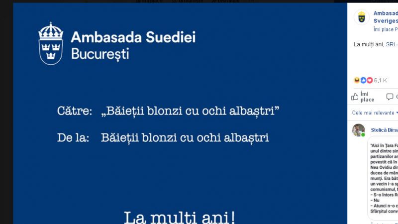 Zilele acestea se aniversează 29 de ani de activitate a S.R.I. Mulţi au felicitat acoperit momentul, dar alţii au preferat să salute descoperit serviciul. Funcţionarii Ambasadei Suediei au postat o felicitare către SRI: “De la băieţii blonzi cu ochi albaştri” către “Băieţii blonzi cu ochi albaştri.” Tenta de glumă prevesteşte o frăţie alta decât a inelelor din celebrul film.
