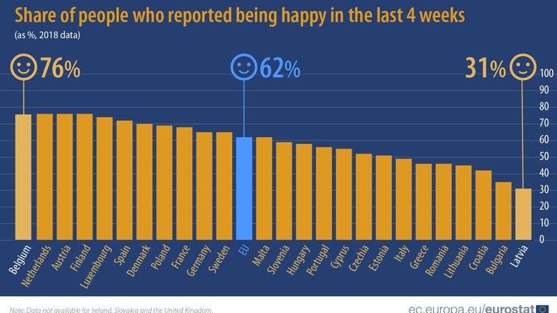 Eurostat realizează anual TOPUL FERICIRII naţiunilor din Uniunea Europeană. Pe primele locuri sunt Belgia, Olanda, Austria și Finlanda, ţări cu oamenii cei mai fericiţi. România se află în coada clasamentului, alături de Letonia, Bulgaria, Croaţia și Lituania, potrivit ultimelor date publicate joi.